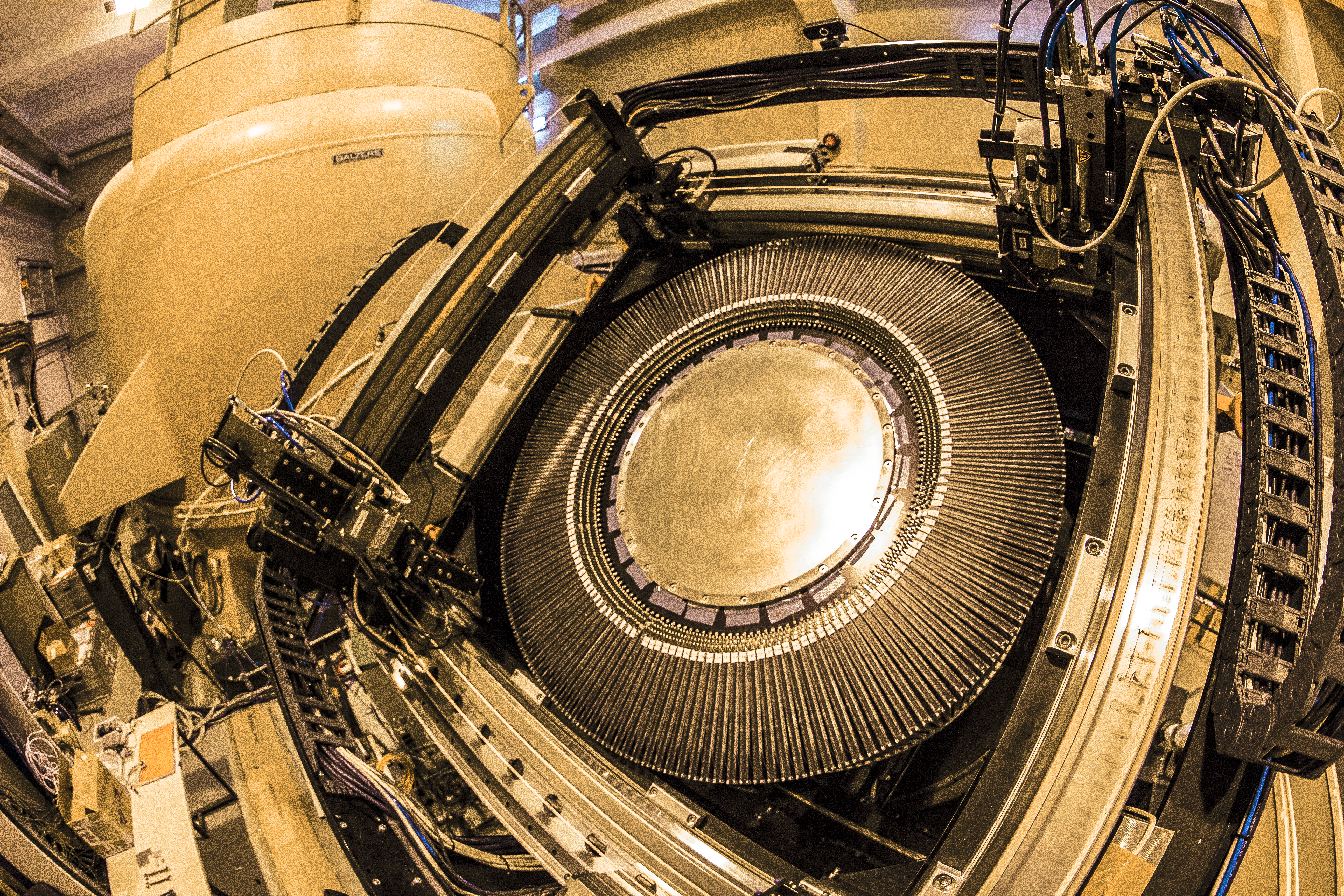 DESCRIPTIONA plate of the WEAVE positioner in the foreground and the WHT vacuum chamber in the background. The vacuum plant is being used as a workshop for setting up the positioner before going on to the telescope.