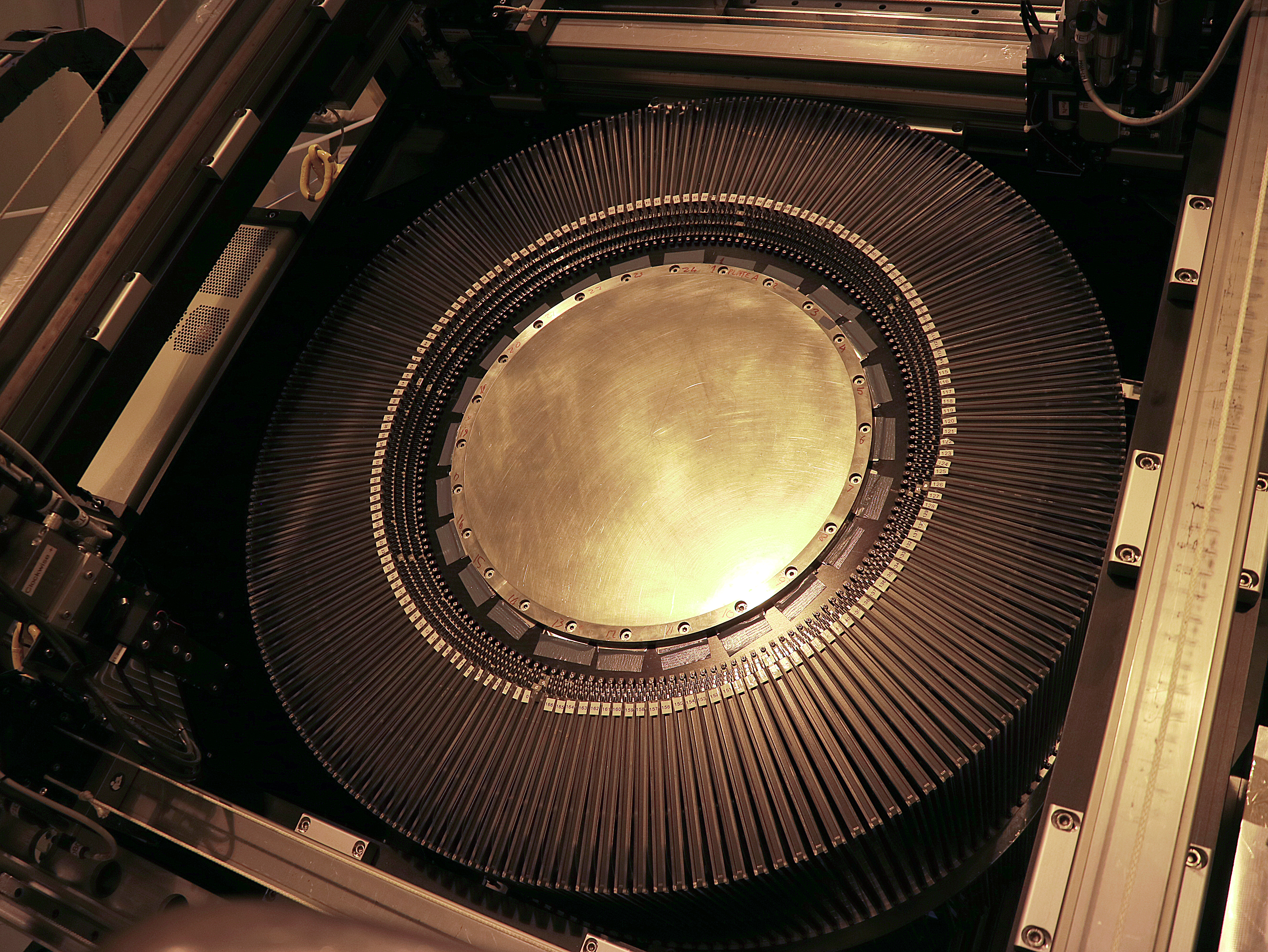 DESCRIPTIONOne of the two MOS plates used in WEAVE. Fibres can be seen arranged in park position at 3 different levels.