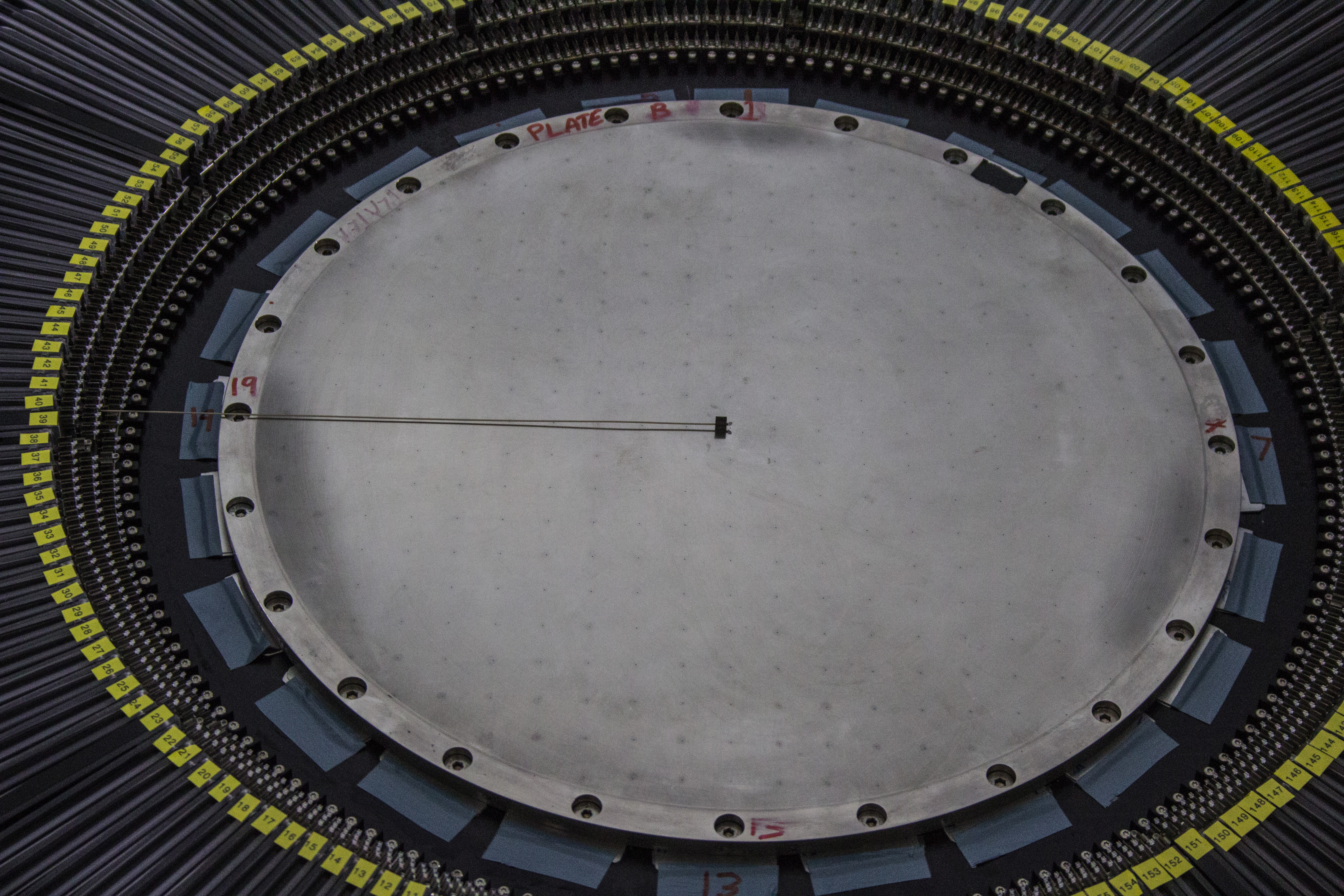 DESCRIPTIONWEAVE MOS plate configured for the first on-sky tests. A single guiding fiber can be seen placed right in the center of a MOS plate, ready for the first on-sky pointing tests.